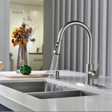 Bwe Kitchen Faucet Brushed Nickel With Pull Out Sprayer 3 Spray Modes Farmhouse Single Handle Singe Lever Gooseneck High Arc Kitchen Sink Faucet With Deck Plate Lead Free Commercial Bar Kitchen Faucet
